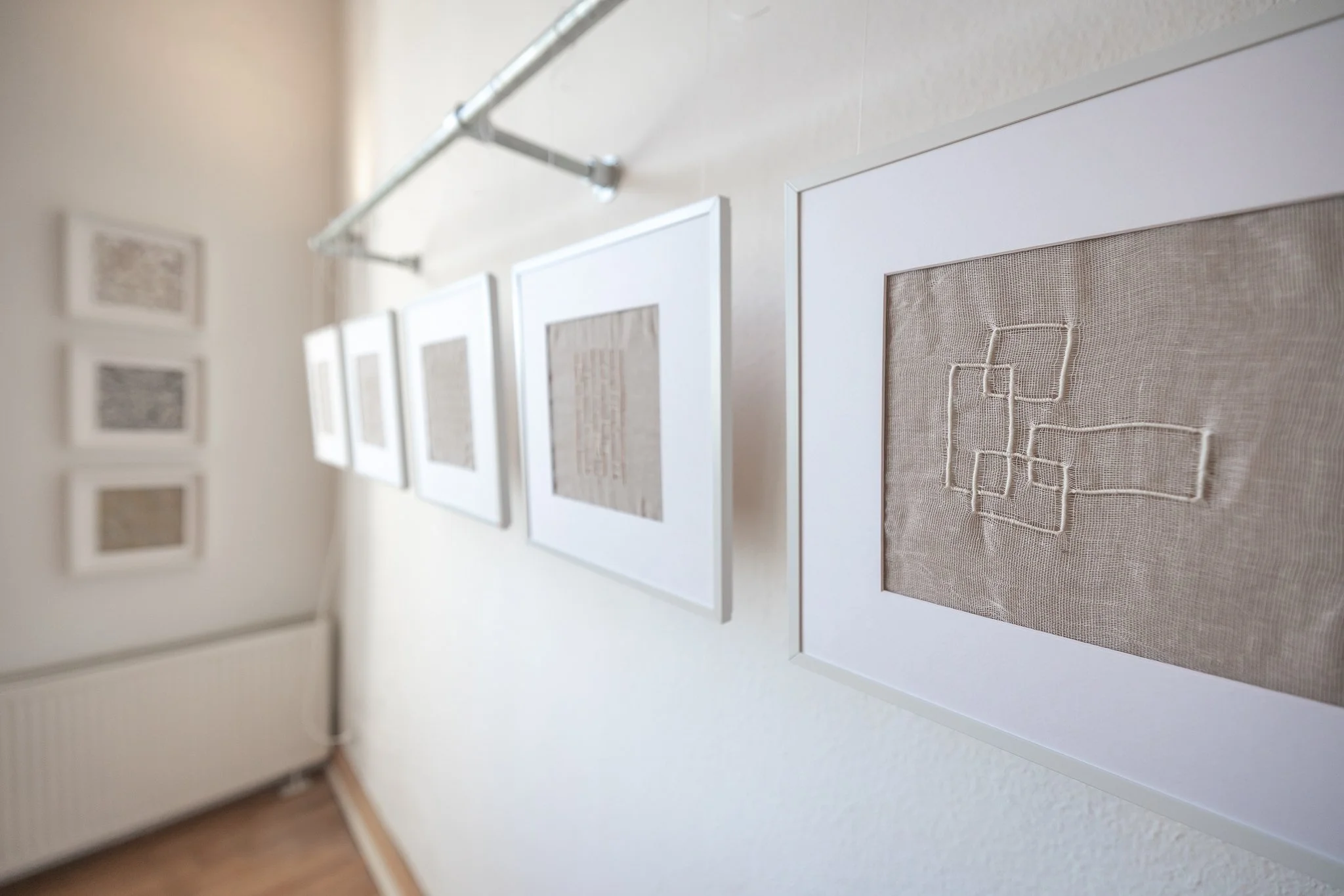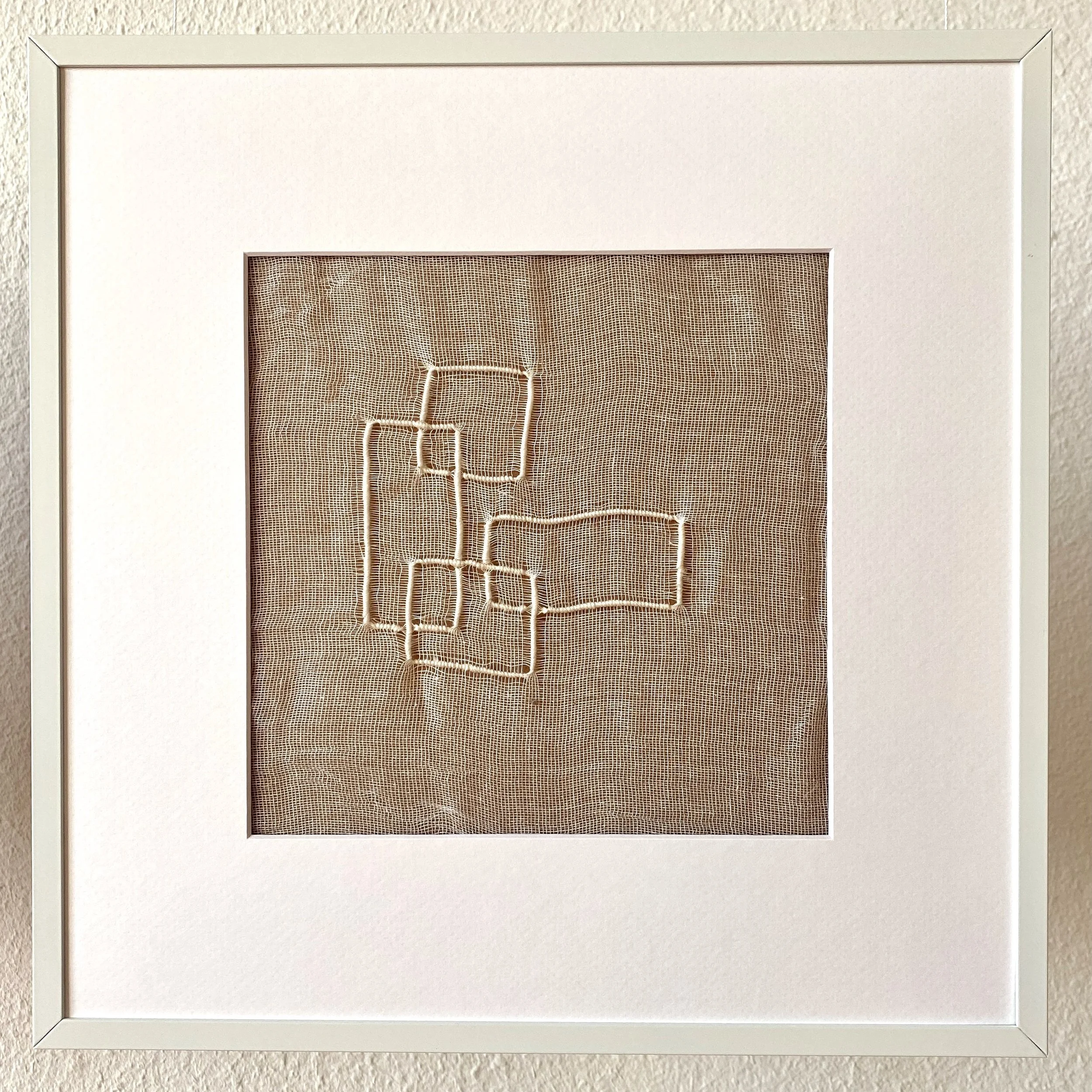 Het kaasdoek is door middel van een dunne gesponnen wollen draad bewerkt. Door een omslagsteek op een vaste afstand van elkaar te maken, ontstaat een geometrische structuur.